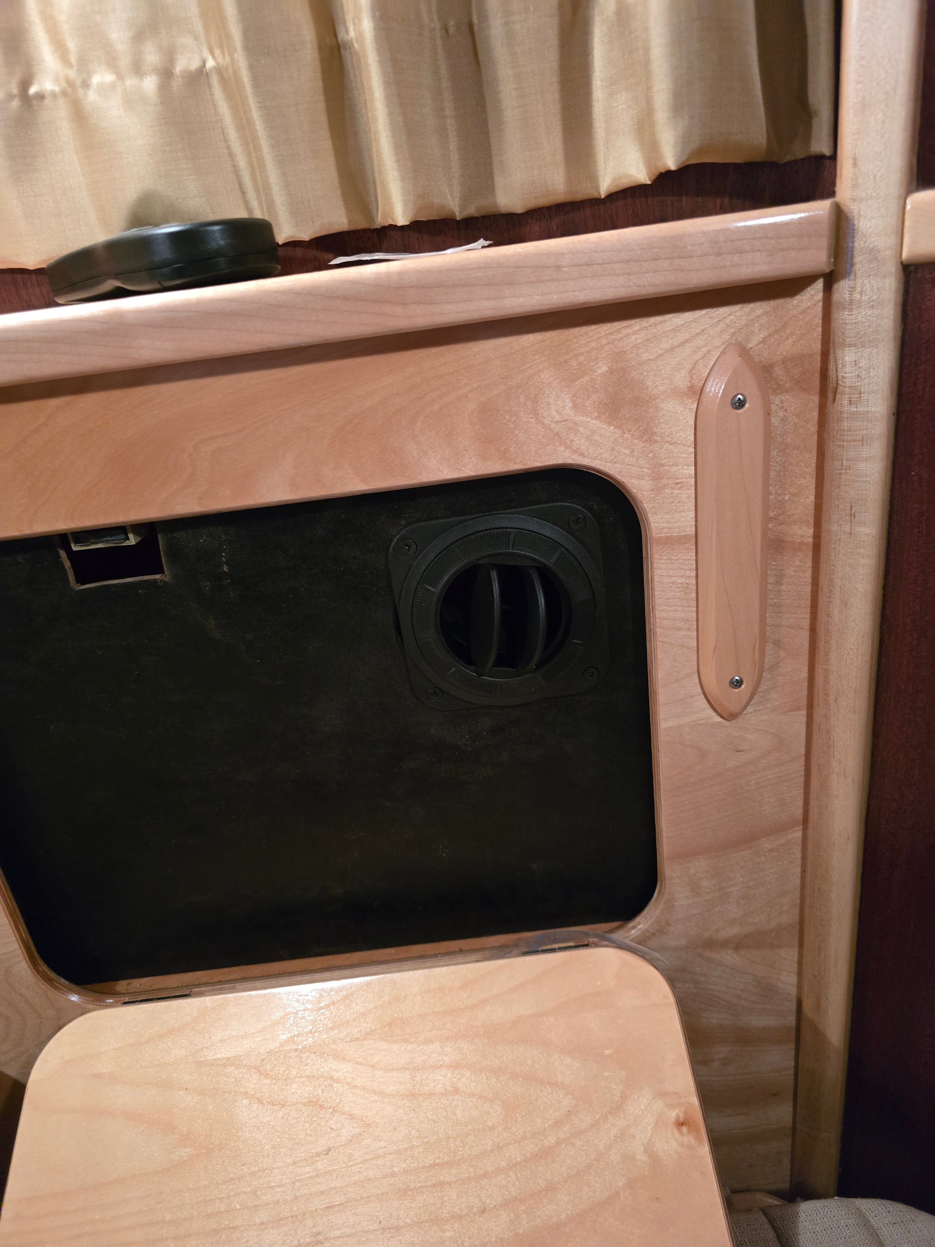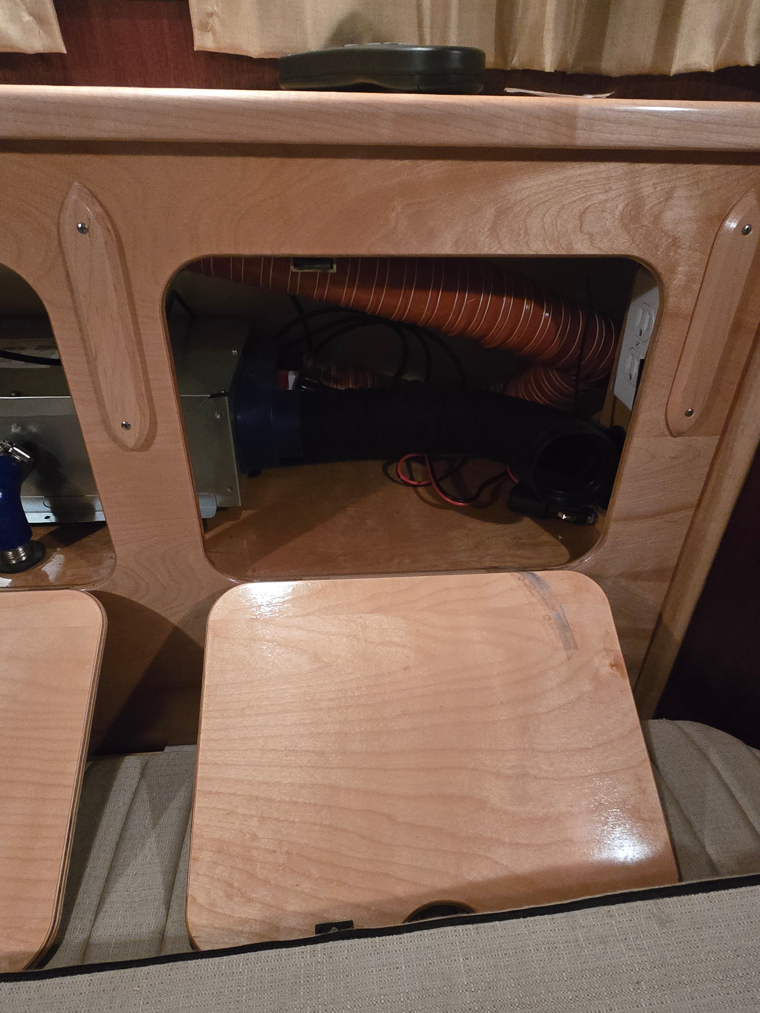 So I removed 1 cabinet door in the front and made a hardboard piece held there with velcro and drilled a couple of holes, 1 for the heat and 1 for the return air. Now there are 2 things you can do, either just lay the seat cushion down, or alter it to make a small piece that folds down.