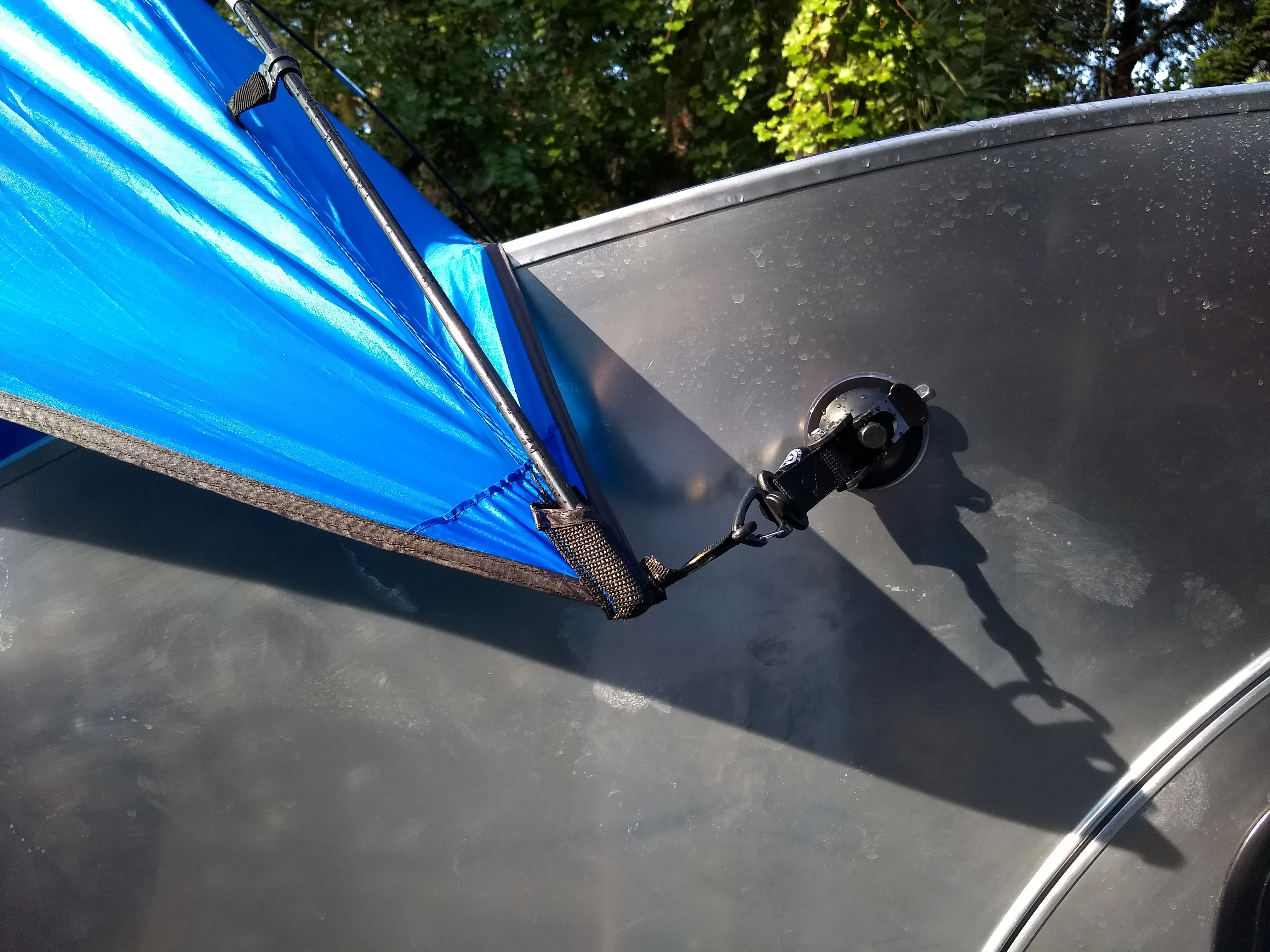 Hold really well and allows the canopy to be positioned ideally over the rear hatch.Do the suction cups hold well? That's an interesting idea...
