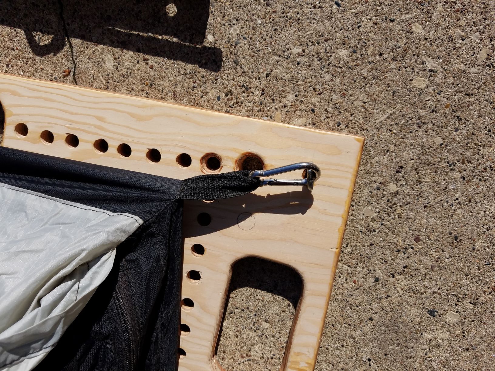 So taking the platform idea I saw at the Campinn/Campout I designed the platform you see below. It's constructed of 1/2 inch marine grade plywood. Measures unfoled 4 ft. x 5 ft and 4 ft x 2.5 ft when folded. Six inches around the edges and two center supports, I doubled the thickness. The entire project was cut from one sheet of 4 x 8 plywood. The two halves are connected with a 4 ft. piano hinge and when folded are held together with two brass window sash locks. I cut several handles around the edges for transporting it and to reduce weight. There are roughly 2000 1/2 inch holes drilled (yes by hand) throughout, that again reduces weight and will allow water to drain away from under the tent. I routered all of the edges. The platform is sealed with multiple coats of Spar Urethane. The platform weights 30 pounds. Its supports my 200 pound frame.
