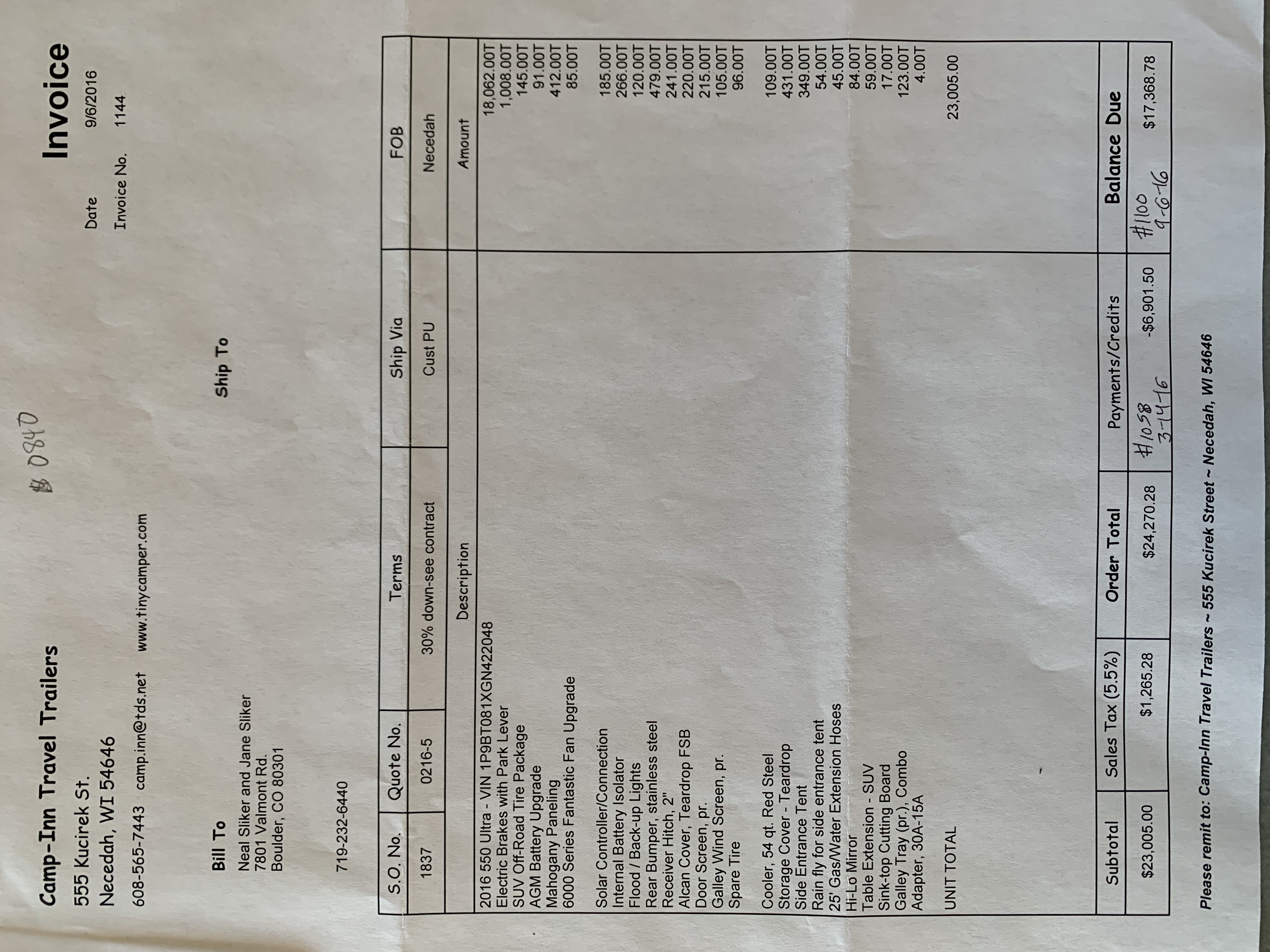 Trailer is a 2016. Its number is 0840. Sorry not at home and was out of signal so just now answering. A lot of up grades to include side curtains for the galley, mirror, upgraded walnut ceiling in cabin and galley. There are trays for the dry storage bins, door screens and a mattress skirt. we have the ultra hard wear which I believe is an upgrade also have the bumper and a 2” hitch receiver. It also has electric brakes and a mechanical parking brake. We have 2 side tents as well. There is a cover for it but since we keep it garaged it has never been used. The fan is a fantastic with rain sensor. When we get home I can send some additional photos as well as the original purchase order that shows all the features. We should be home tomorrow mid morning. Paid 23K+. Hoping to get 16K