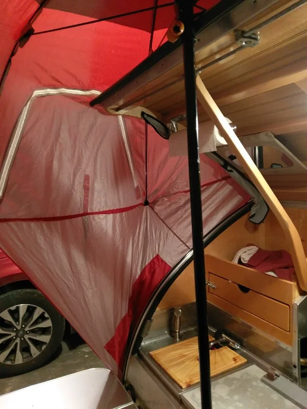 Edit: added some photos. I forgot to take a picture of using a small bungee to wrap around the hatch handle and around the pole to keep it centered, but hopefully you can visualize that yourself. You can see it a little bit in the 'underneath' shot . Since the teardrop is in the garage, I didn't have the room to put the cooler table on the side; but with that and a cooler on top, I can have that 'wing' on that side over the cooler and bungee'd down. I did remember to grab a snapshot of the 'gap' I refer to at the top of the hinge. To cover that in rainy weather it's some clamps and cheapo cut up tablecloth so the rain doesn't flow right into the hatch. If it's really windy/rainy of course I still close the hatch when I'm not directly under it/needing to use the galley. But as mentioned it's quick and easy.