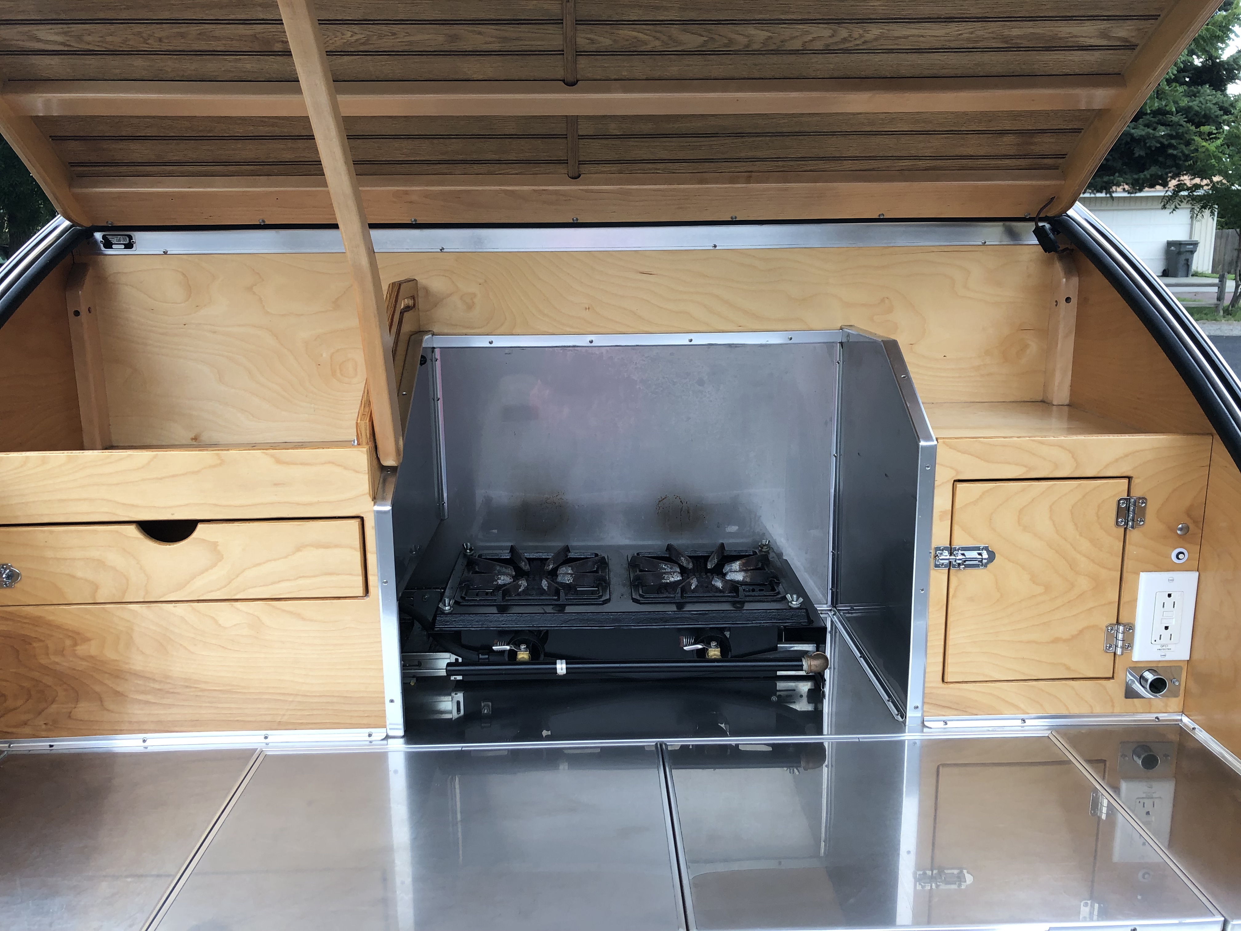 Separate Cooler included, queen size mattress, furnace, cabinets, and insulated roof.