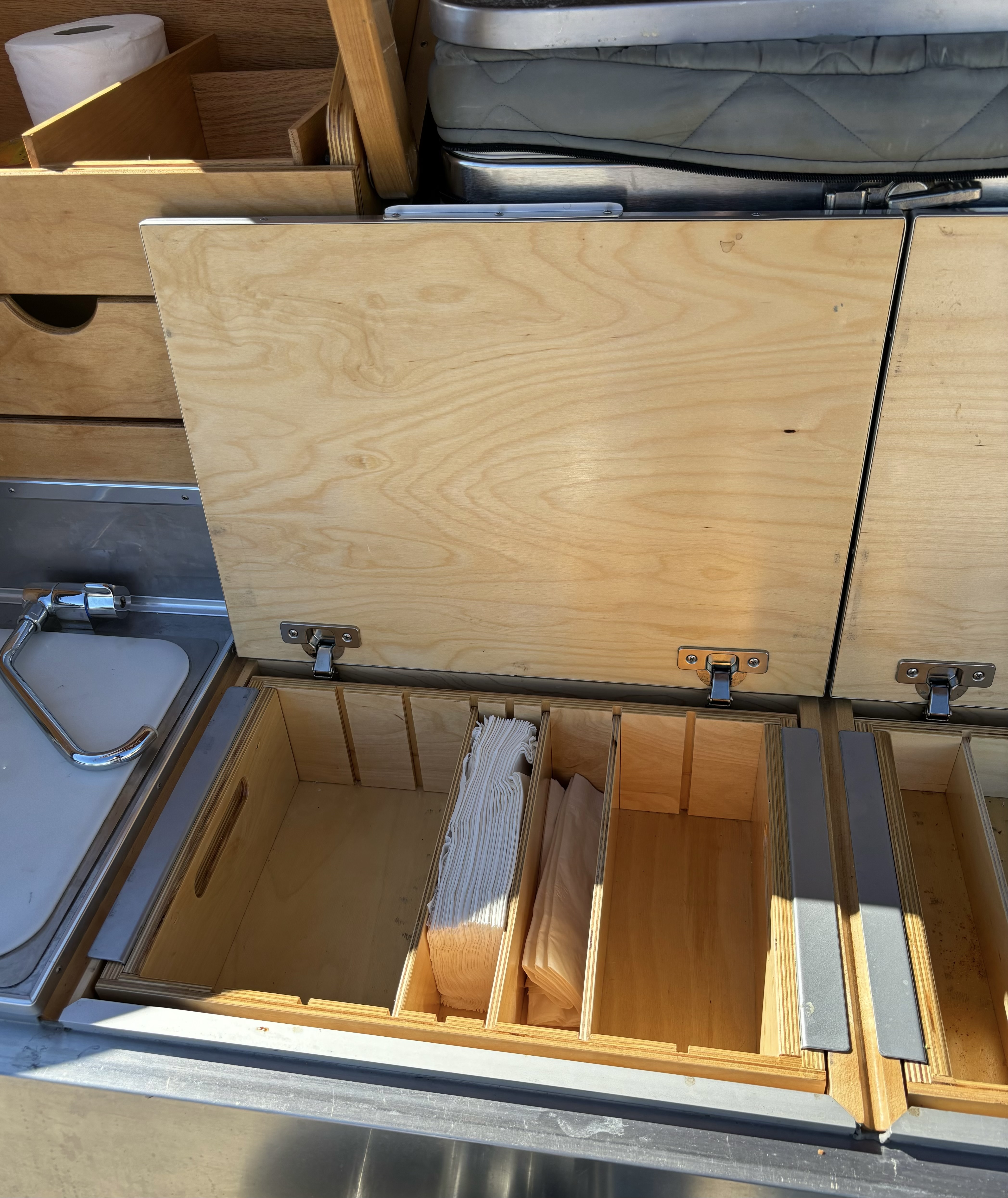 - Stainless steel kitchen sink with fresh water and gray water tank with tank/battery monitor