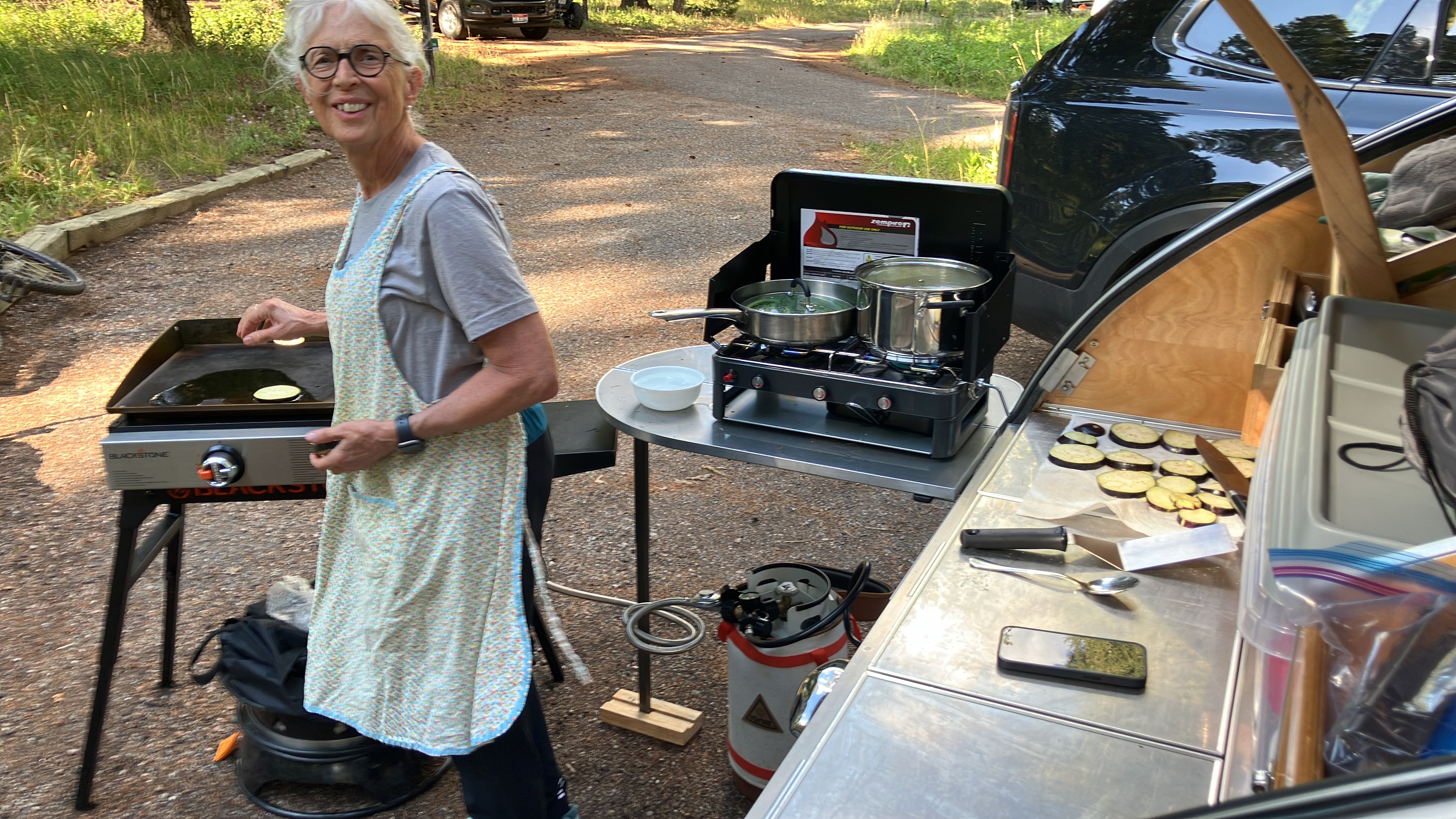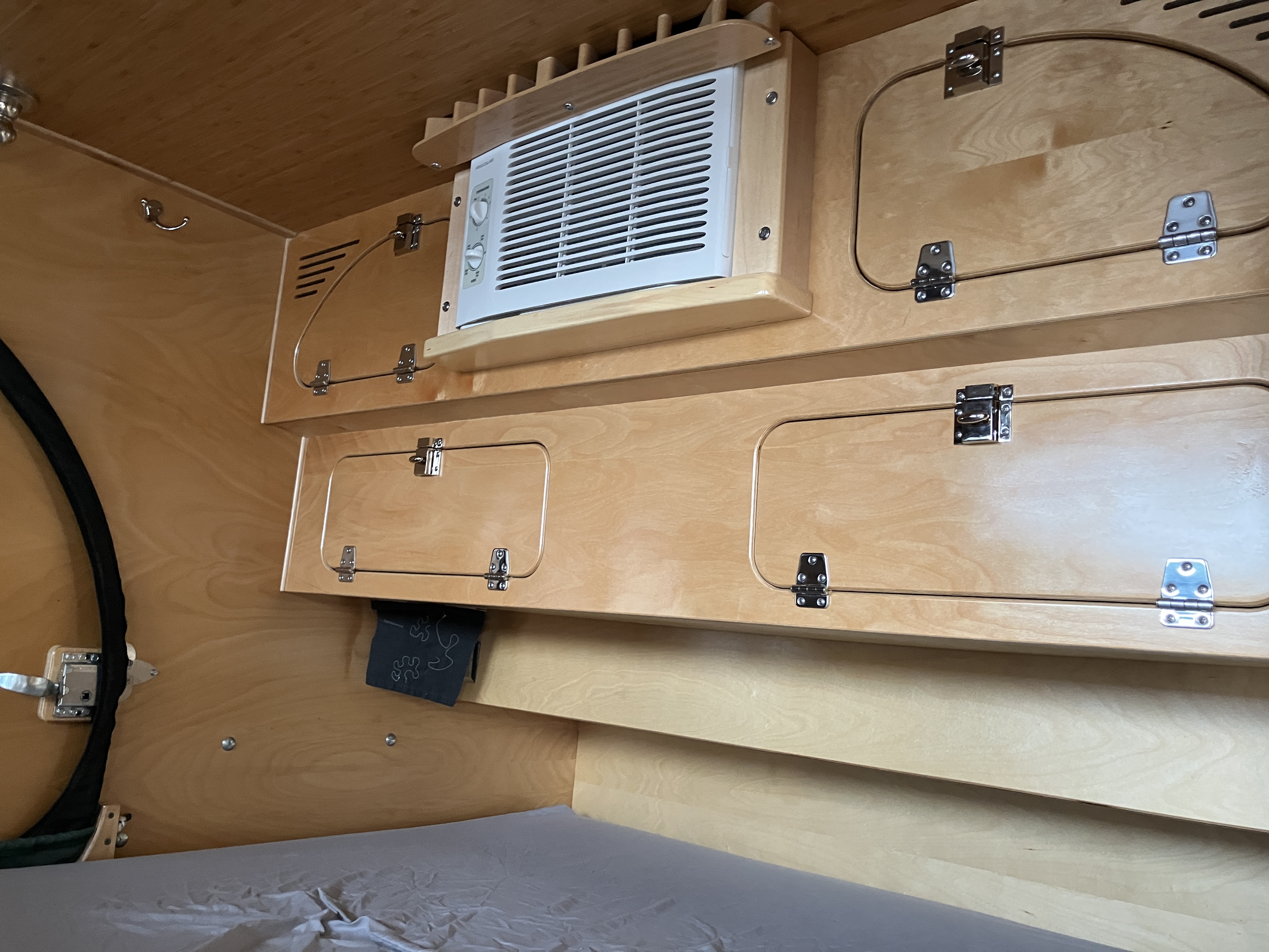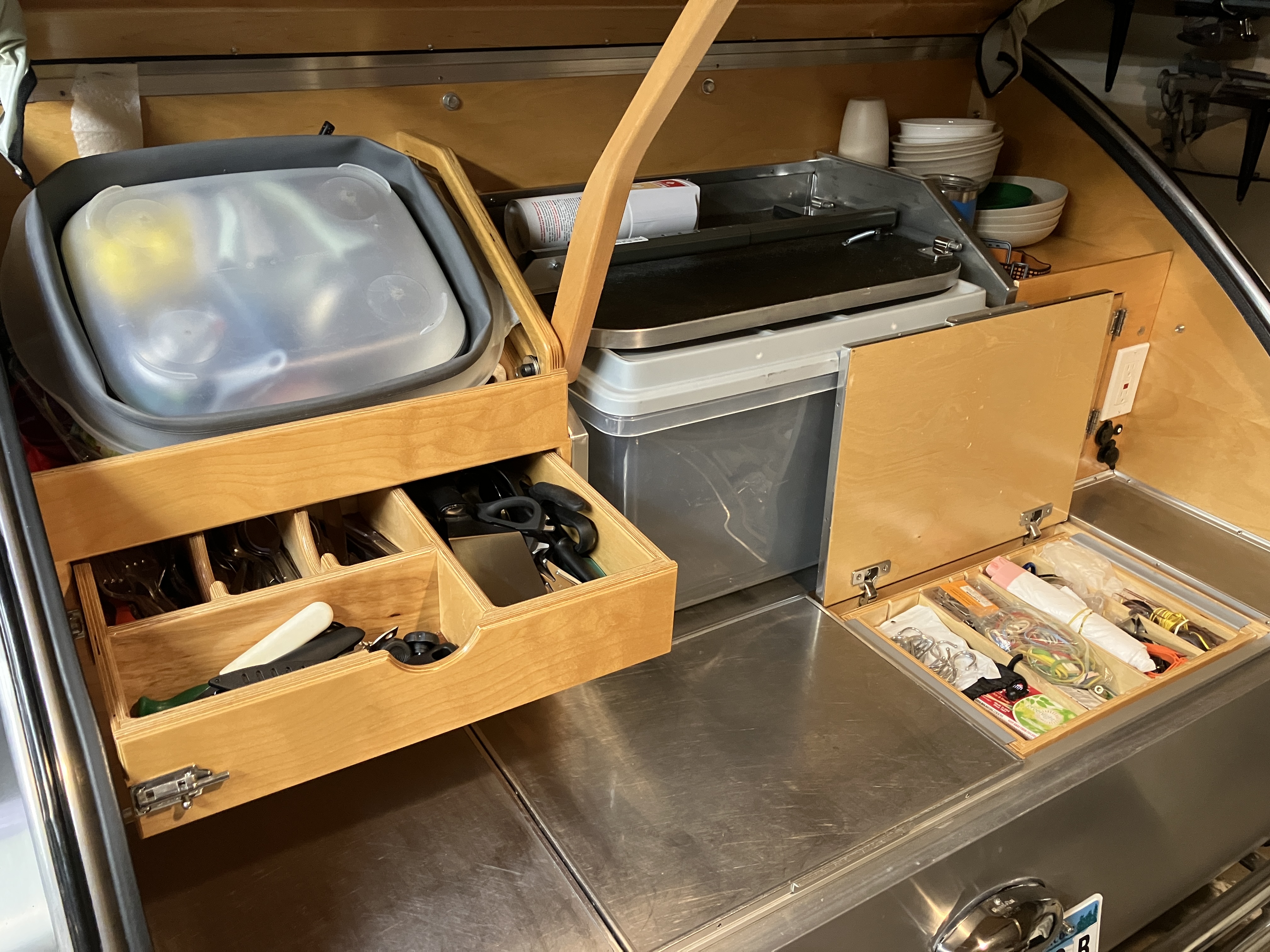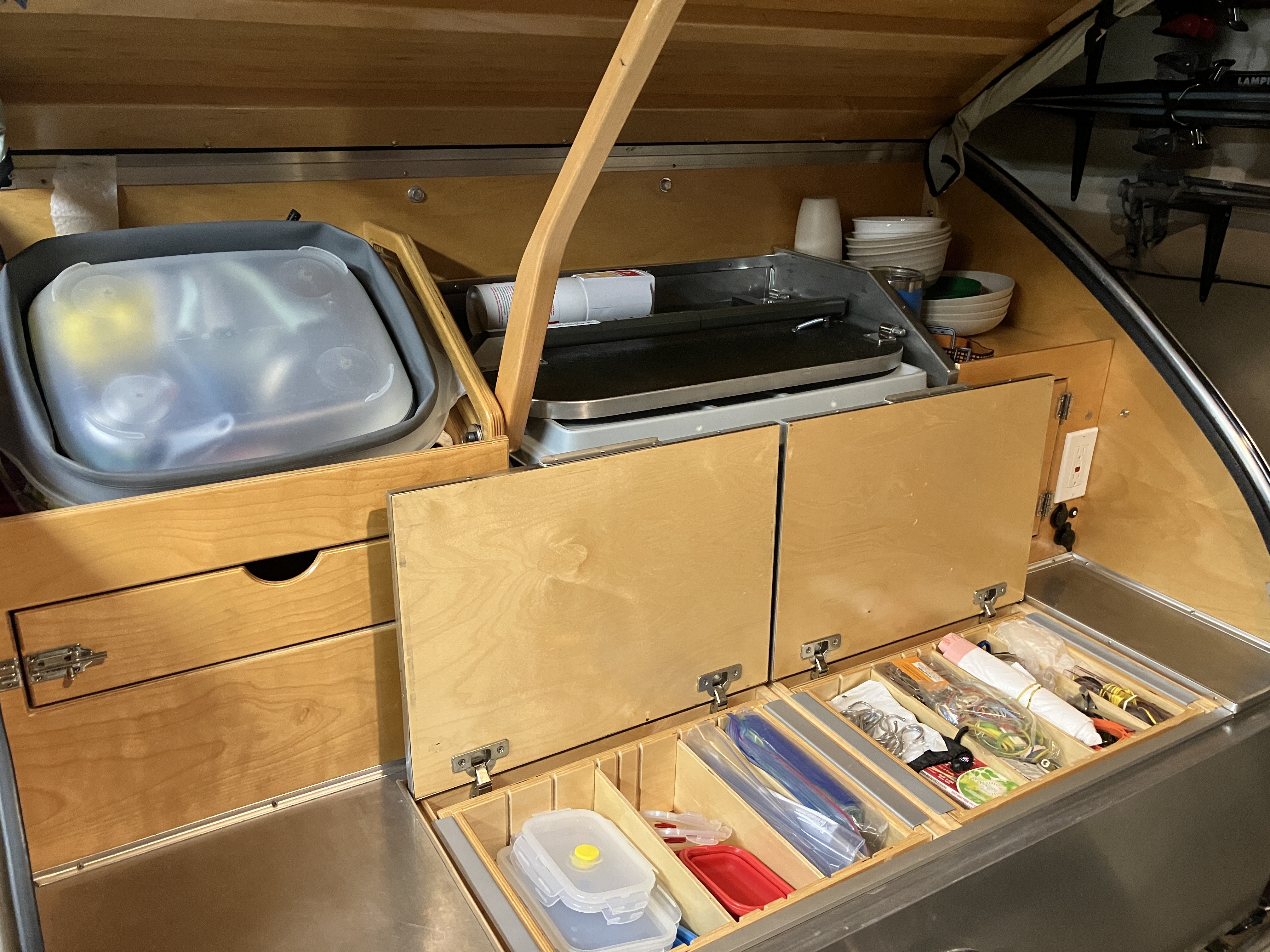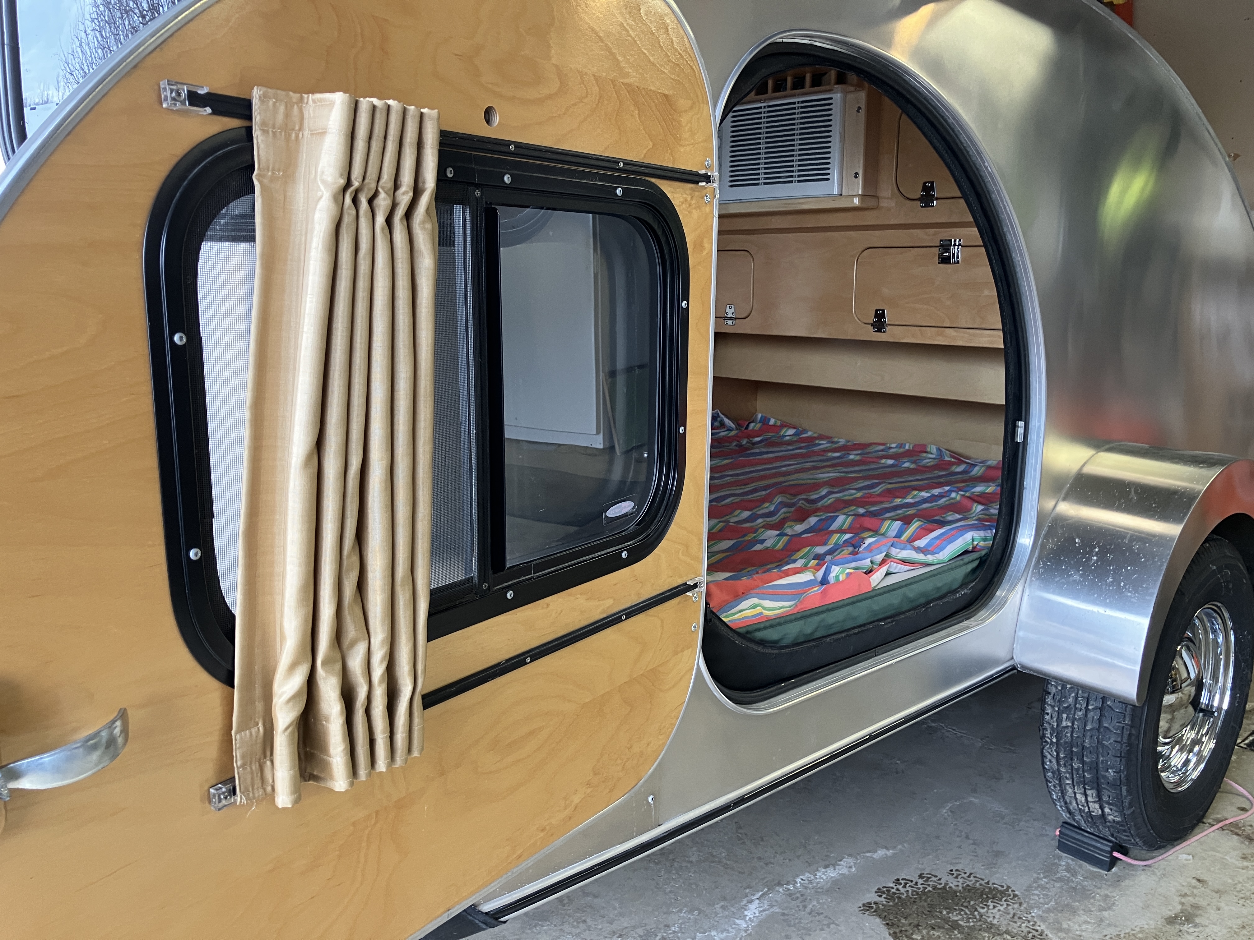 We are offering our 2017 Camp Inn 560 Ultra Raindrop Teardrop Camper (#874). We are the second owners to love this camper. We’ve traveled west to Oregon, east to NYC and south through the Appalachians to the Smokies and to Florida. Original owners purchased directly from Camp Inn and traveled about the upper Midwest about 10K miles. All maintenance done at CampInn. We live in Minnesota. The camper does not have a factory installed LP gas tank, stove or water tank. We carry our own small LP tank along with a stove and Blackstone griddle. That leaves us with three additional storage areas under the bed.