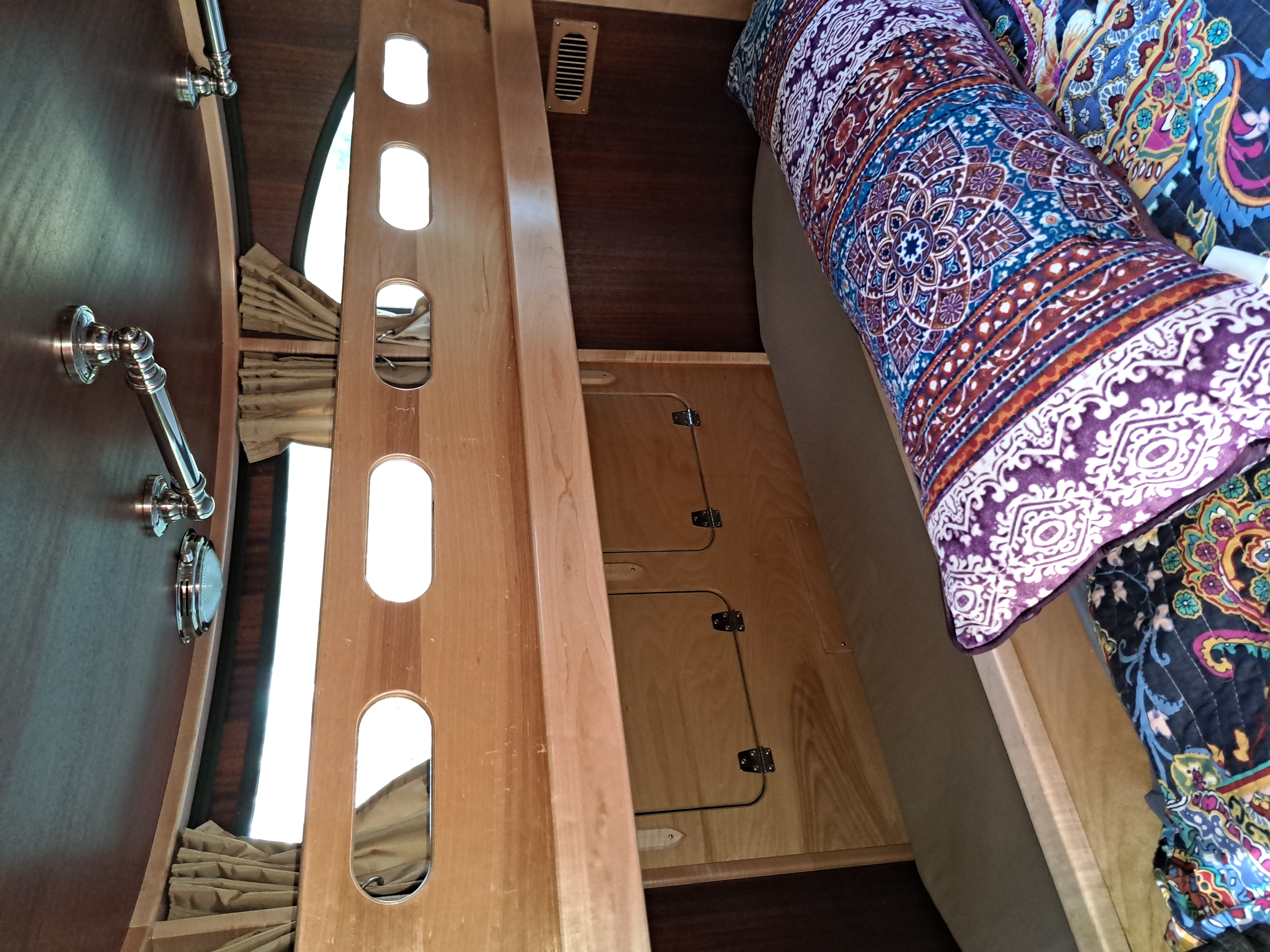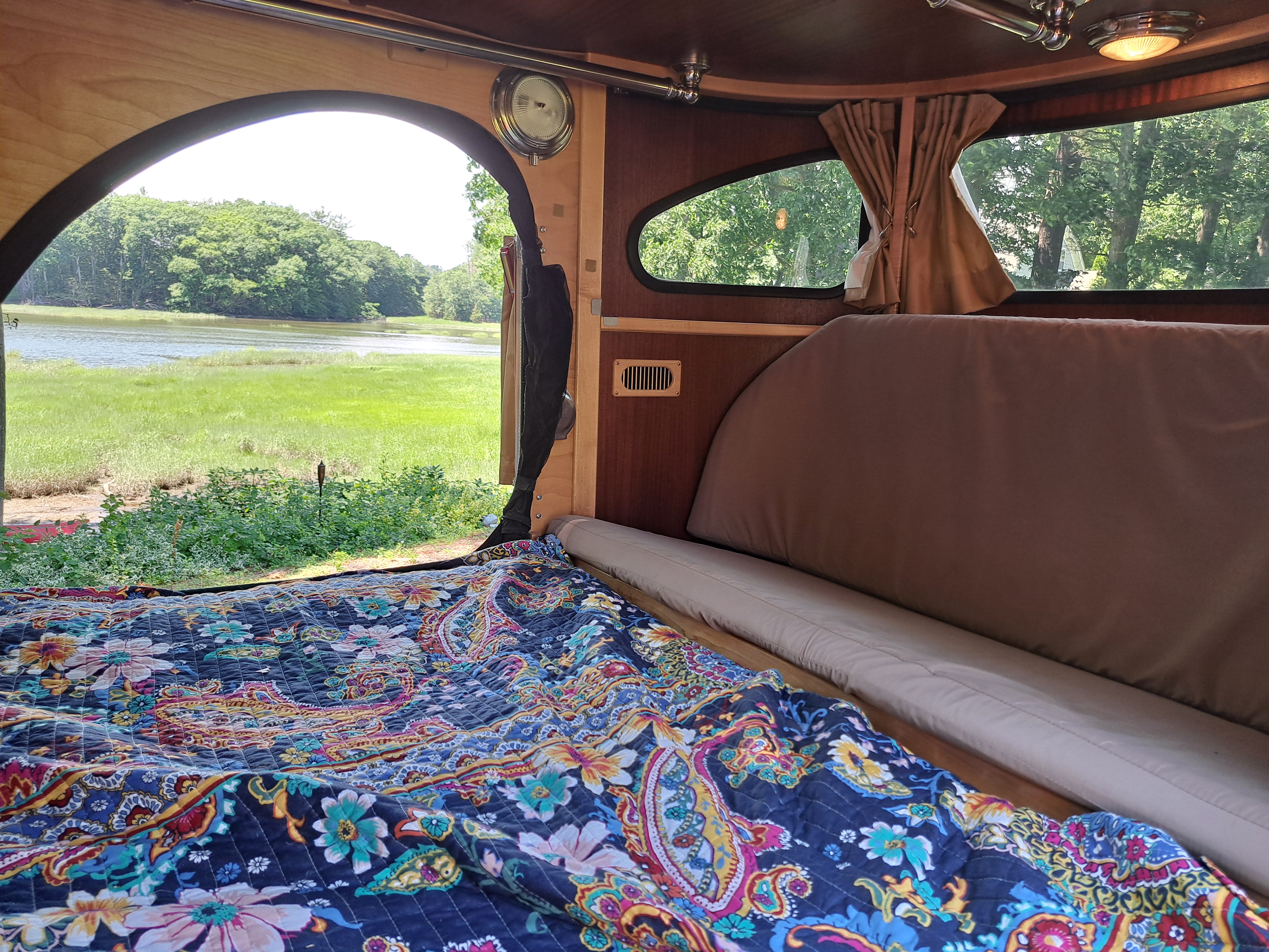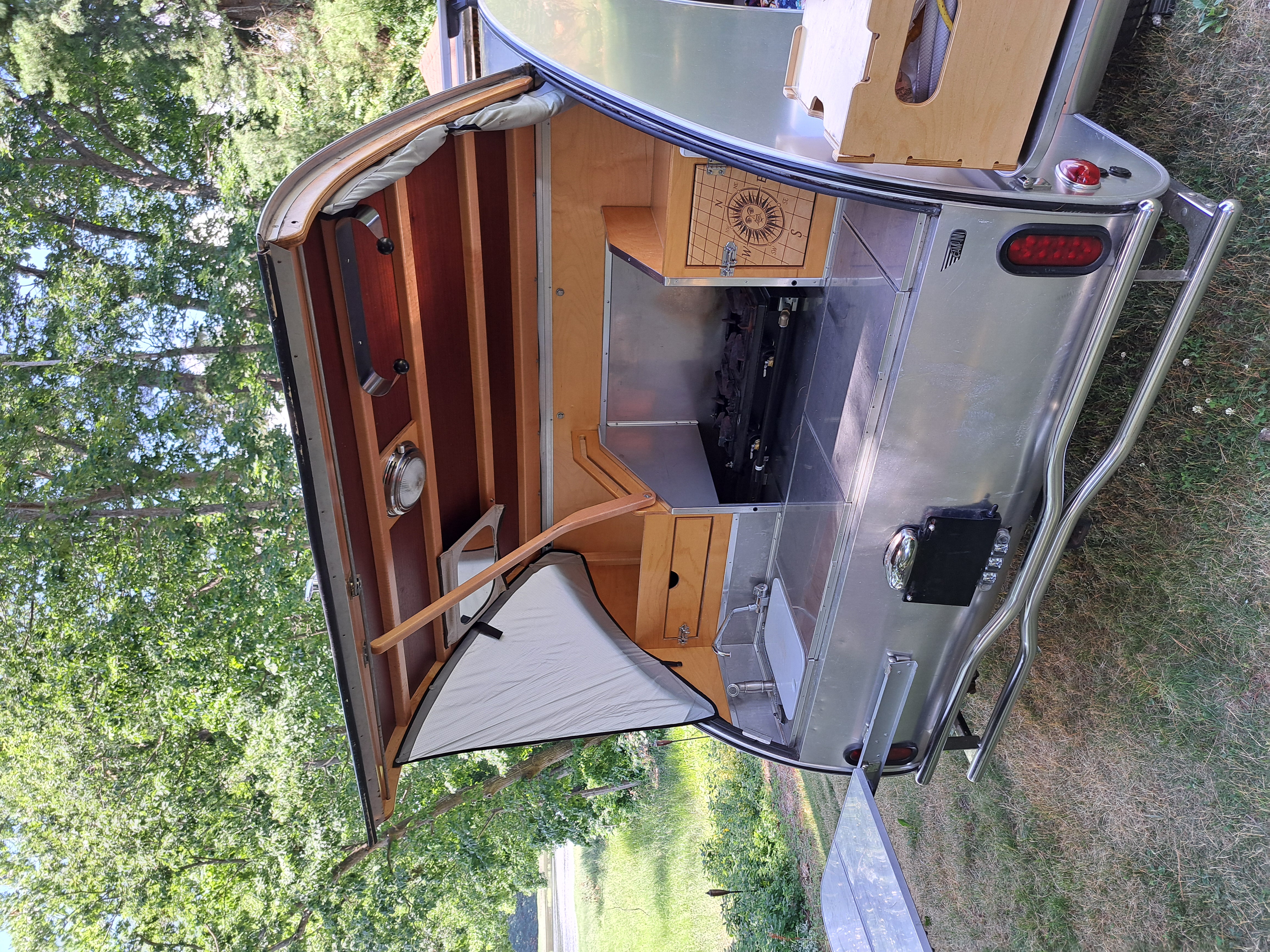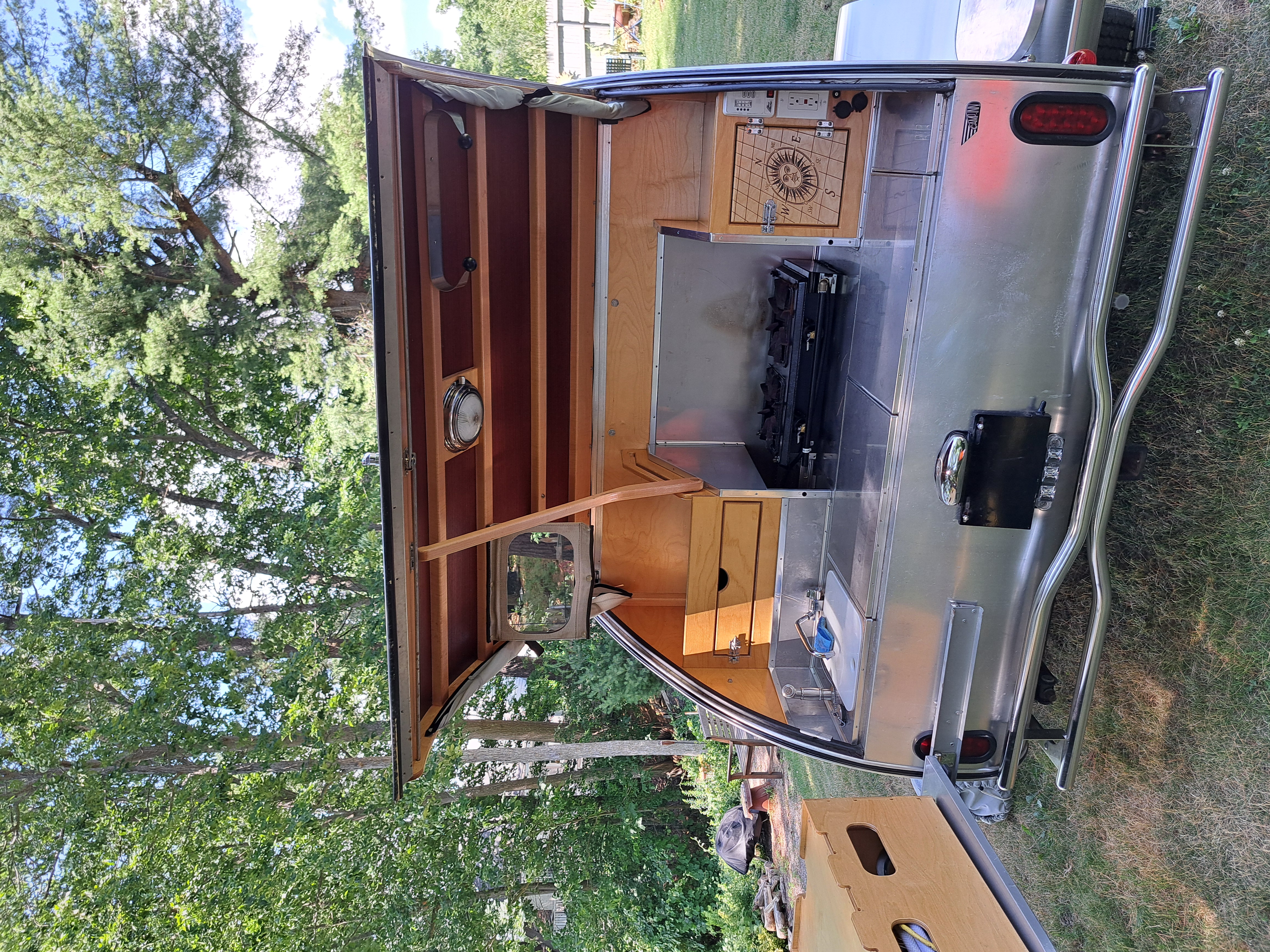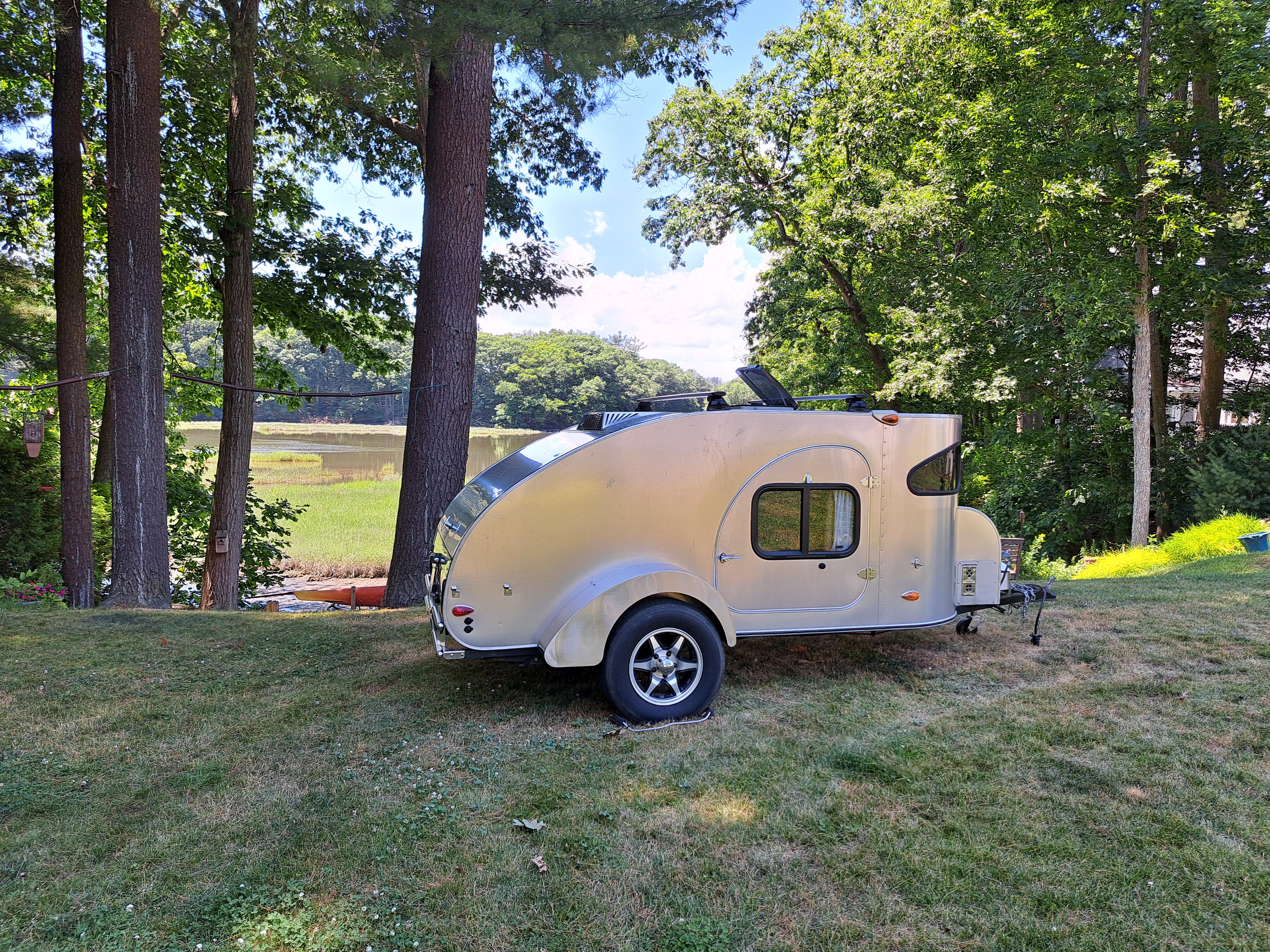 We purchased this wonderful camper in June of 2018 and have used it on camping adventures throughout New England for music festivals, kayak trips to Maine and bicycling trips in Vermont. One long distance trip back to the Necedah Wisconsin nest in 2020 for a CampInn – CampOut gathering and a visit to the factory for a tune up and the addition of a roof rack. We keep it garaged during the NH winter from November 1st to May 1st. During the warmer weather it’s either on a trip, in our driveway preparing for a trip, or in the backyard overlooking the river. It makes a great backyard cocktail bar or quiet place to read a book. For the first 2 years we pulled it with a Honda CRV. That did fine but was a little underpowered. The CRV has a 1500 lb maximum tow rating and we were probably little over that once loaded. Before the trip out to Wisconsin we upgraded to a Honda Ridgeline and now I don’t even know if it’s there! The Ridgeline has a 5000 lb towing limit. We have loved it and get compliments wherever we go, but it is now time for us to move on. At our age it will be nice to have an inside bathroom, and the 90 pound Labrador Retriever would enjoy a bigger bed. He sleeps in the lower bunk but even that is a bit cramped for him. This camper came loaded and then we added some other amenities to fit our style. We are the 2nd owner but it was basically unused when we got it. The original owner ordered it but 6 months later when it was ready he could no longer use it. I think he slept in it 3 times in his garage and never used the stove. He bought it in April 2018 and we purchased it that June.