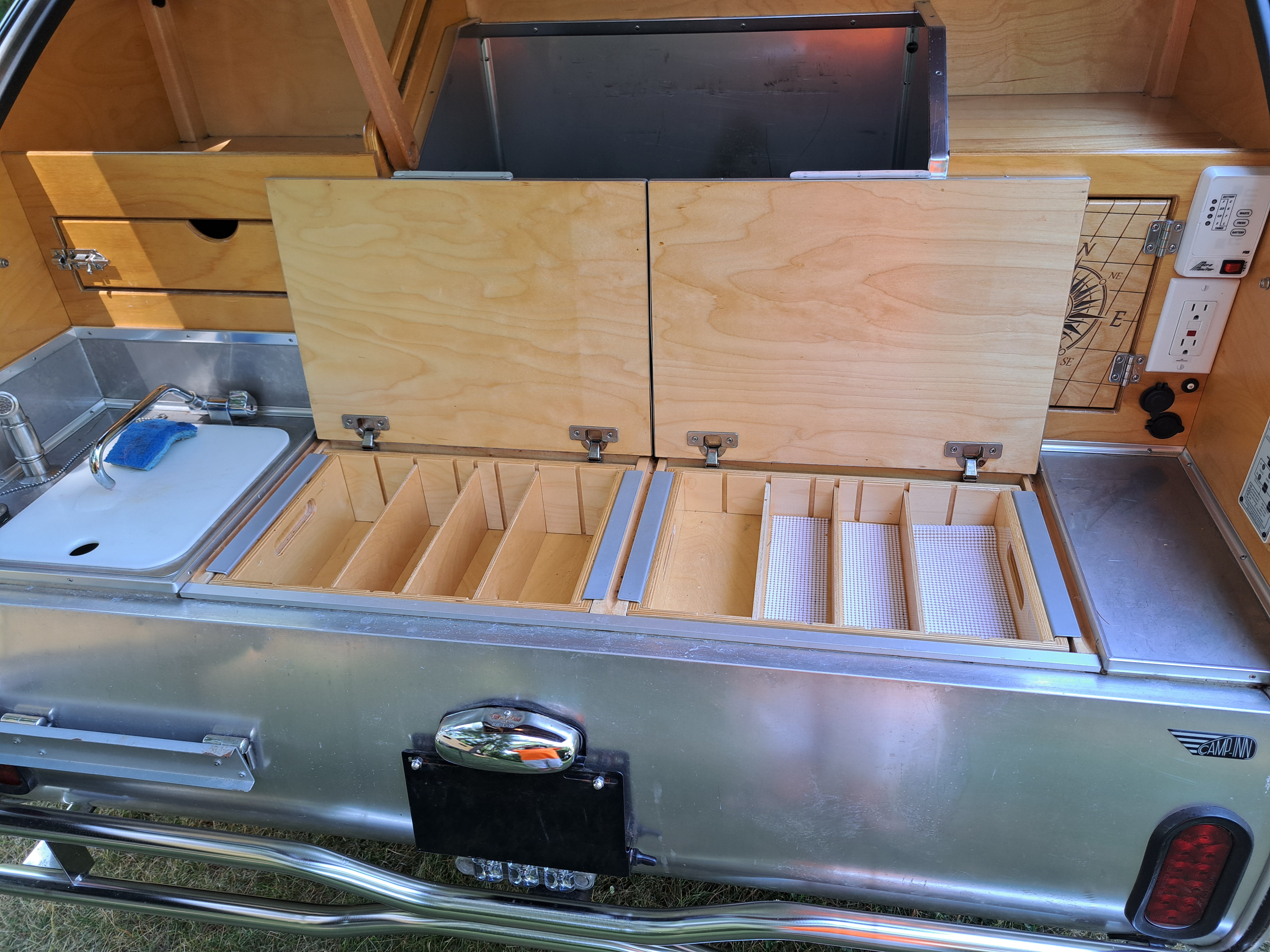 Yakama Roof Rack, Couch Pet Covers, Hi-Lo Mirror, Wood Crate / Alcove Storage, Camp-Inn Mud Flaps mounted to 2” Ball Hitch.