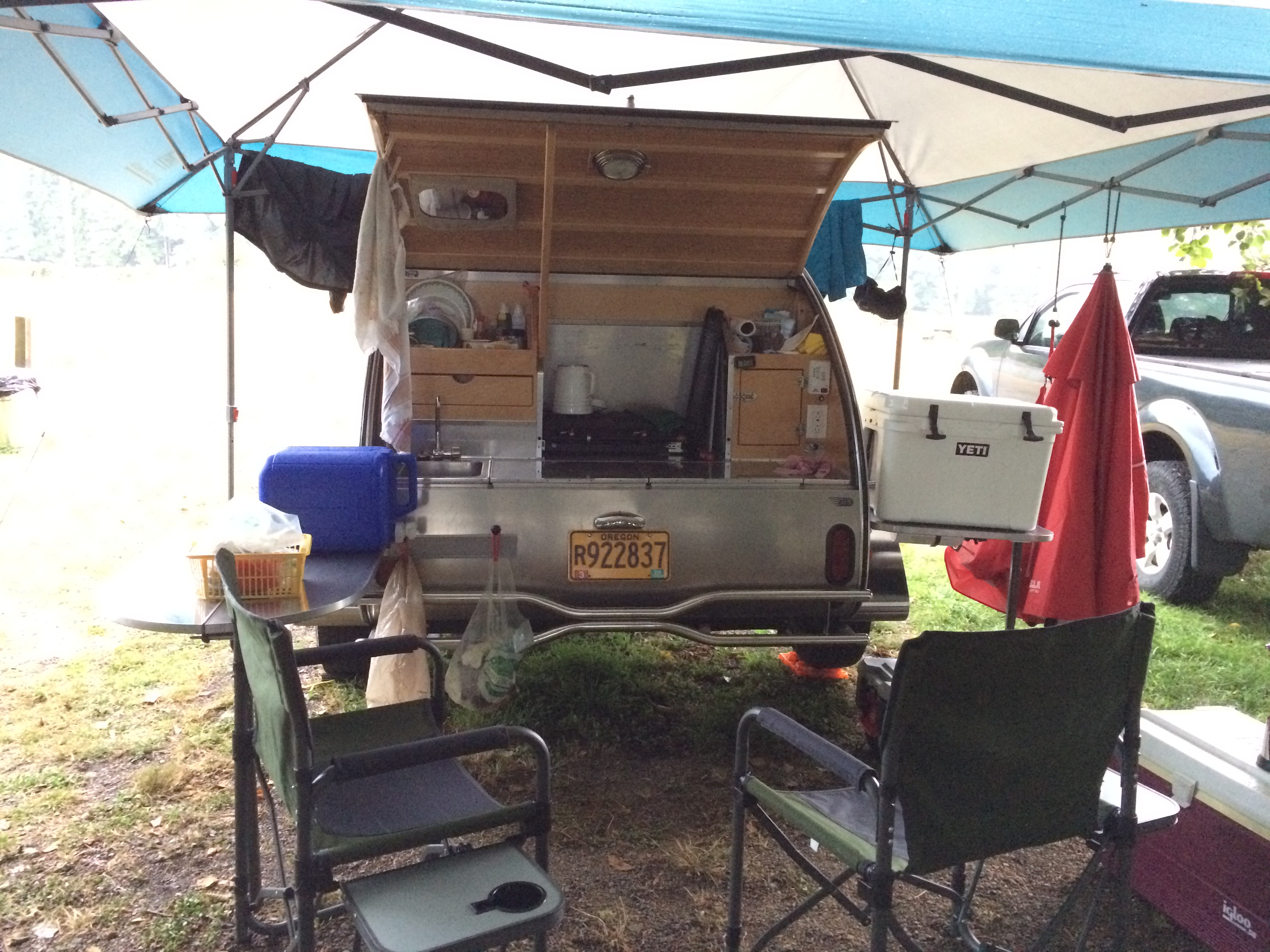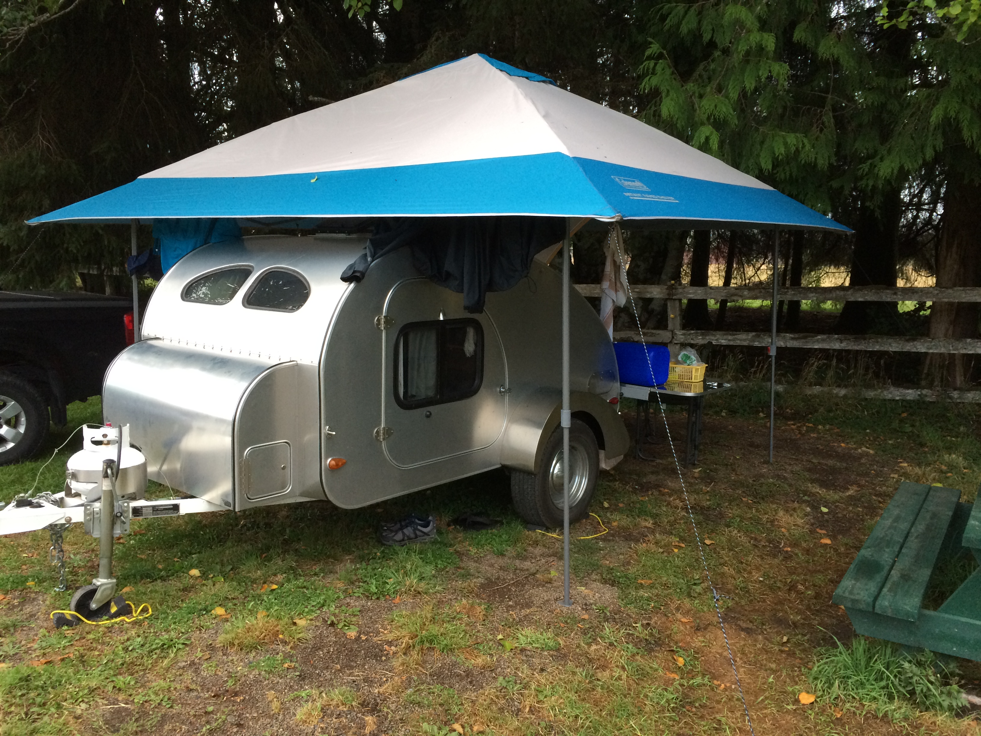 Took a few of those to the body and my car is riddled with dents and a busted windshield. Teardrop only got a couple very minor dings as we had 2 tarps over it in preparation and we held the tarp up off the skins best we could to minimize any damage. We need to get a better canopy setup. I know tarps are not the best, but they definitely helped in this situation. Was a great trip though and tons of fun. Much excitement.