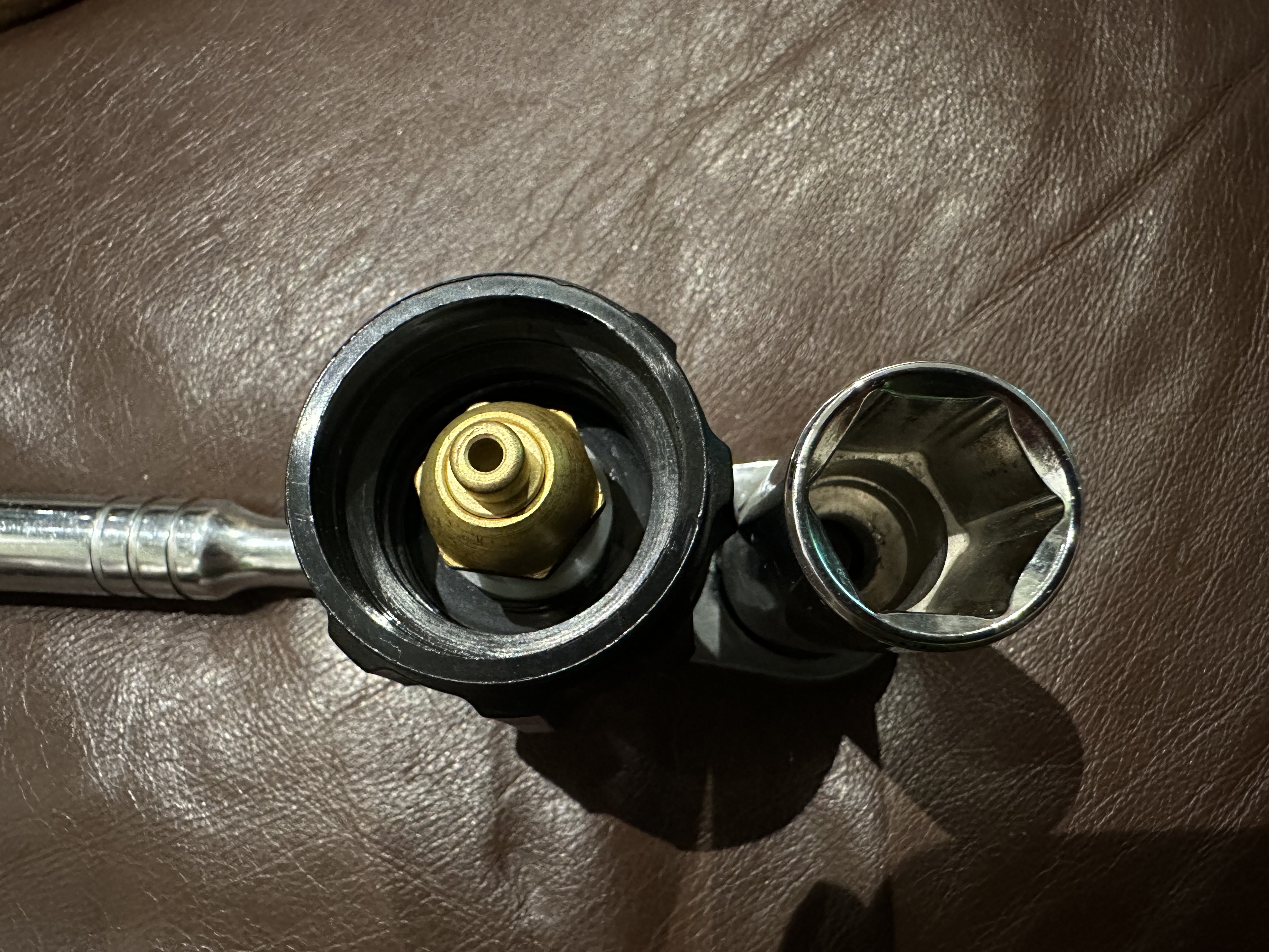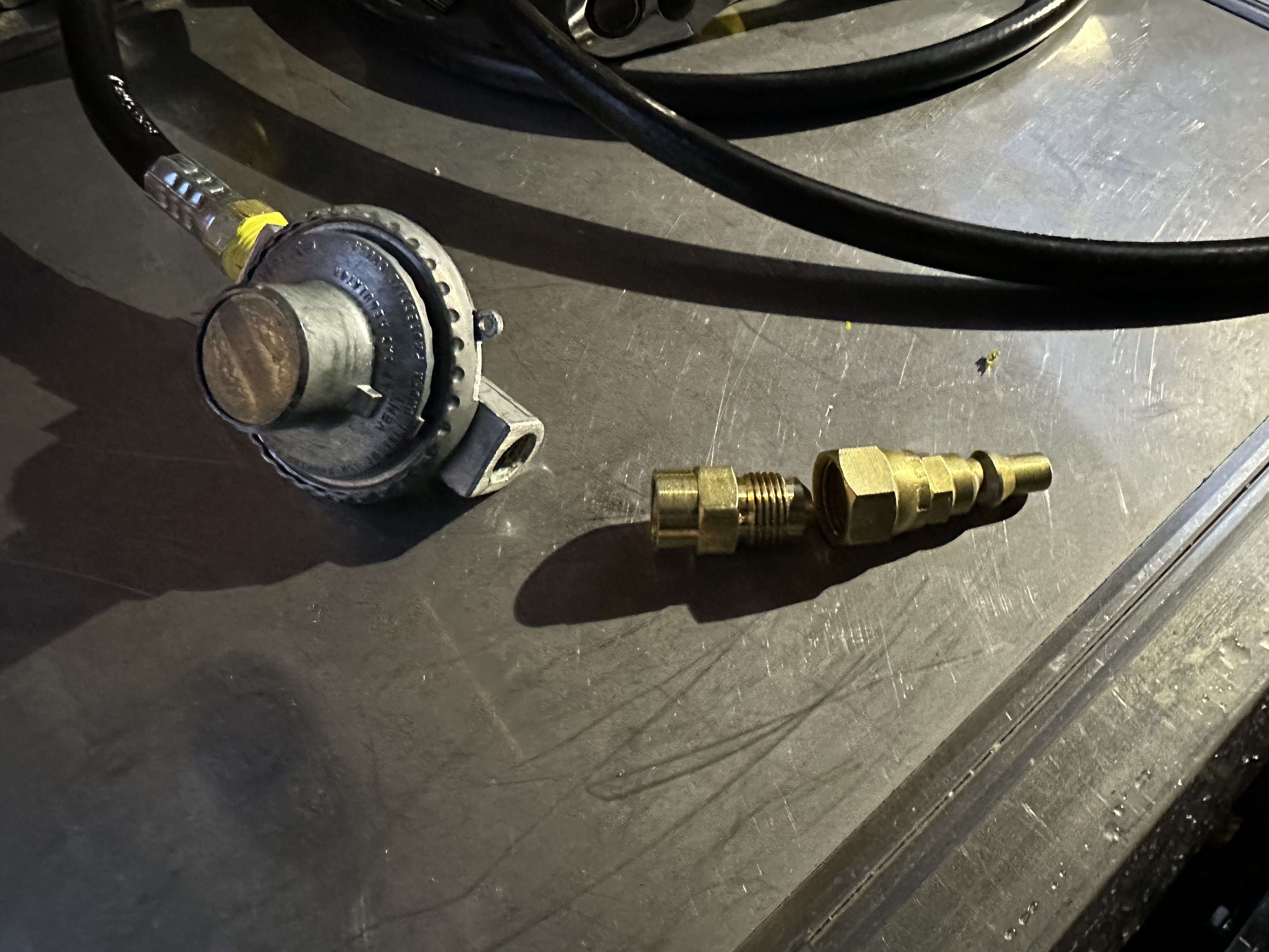 The Mr Heater hose came with the regulator and the proper female QC for the male QC on the Big Buddy. (Smaller or alternate versions in the "Buddy" line don't have this male QC.) All we had to do was add a male QC for the side port.