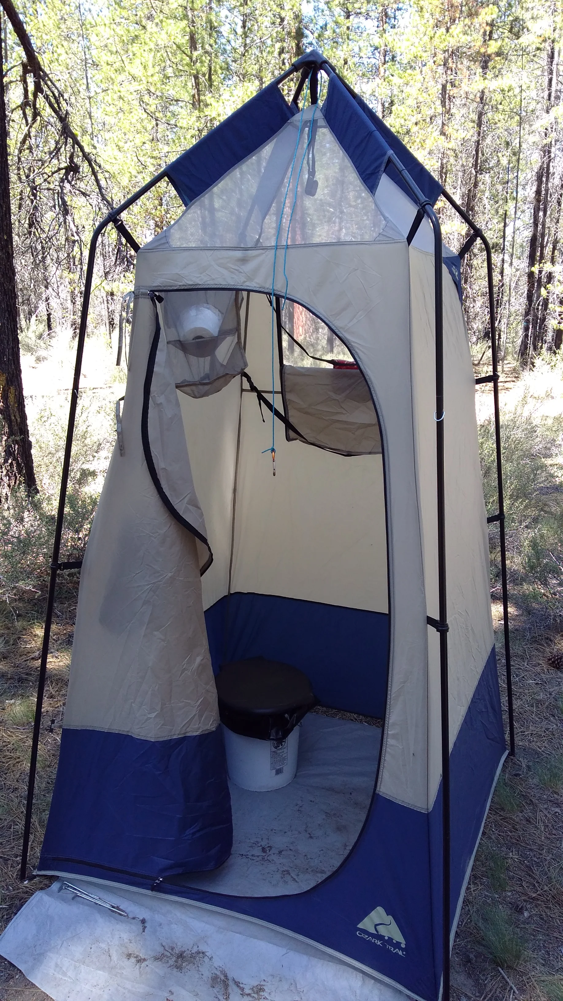 Our first attempt, using the hook in the center of the ceiling of the privy tent, had the bottom of the solar shower hanging 4 feet above the floor, making for a very awkward and unsatisfactory experience.