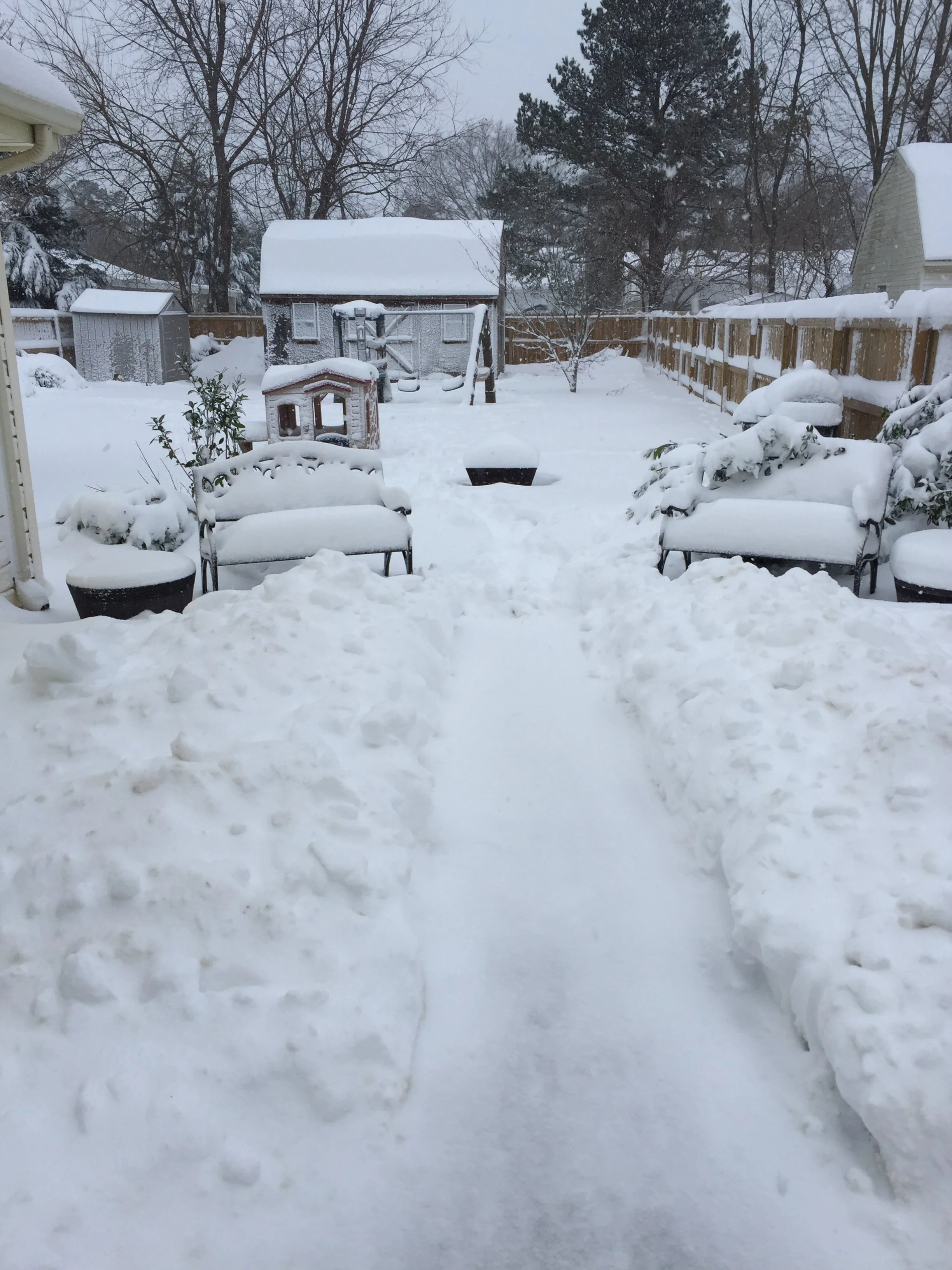 The 1st photo was taken hours before it stopped snowing; the 2nd photo was my friend’s endeavor to clear her sidewalk; the 3rd is her backyard.